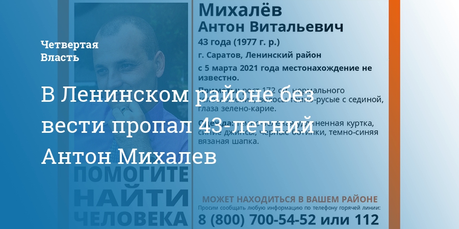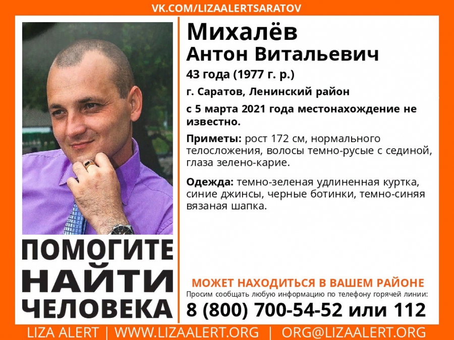 В Ленинском районе Саратова без вести пропал 43-летний Антон Михалев. Подробности рассказали волонтеры поискового отряда «Лиза Алерт».