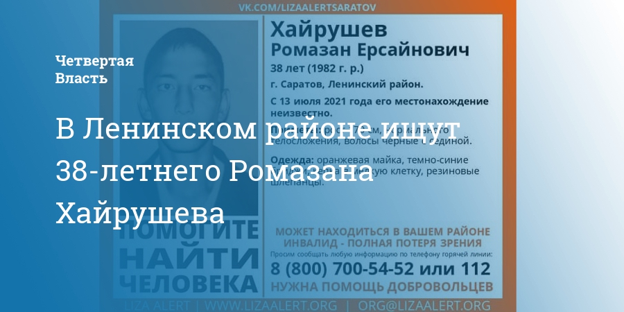 В Ленинском районе Саратова потерялся 38-летний Ромазан Хайрушев. Об этом сегодня, 19 июля, рассказали волонтеры поискового отряда «ЛизаАлерт».