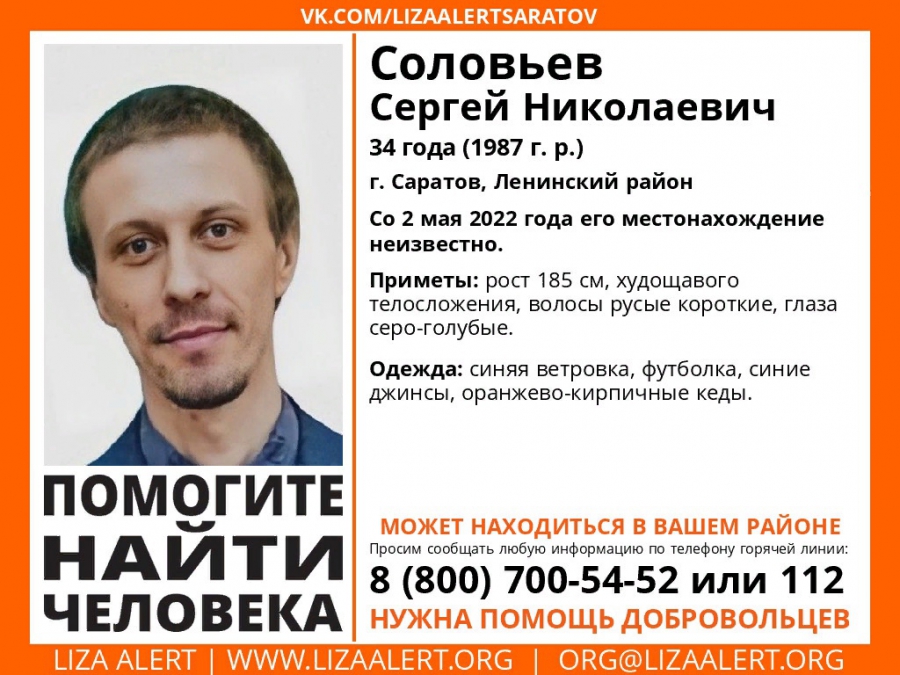 На территории Ленинского района Саратова без вести пропал 34-летний Сергей Соловьев. Как сообщили в поисково-спасательном отряде «Лиза Алерт», он не выходит на связь уже больше недели.