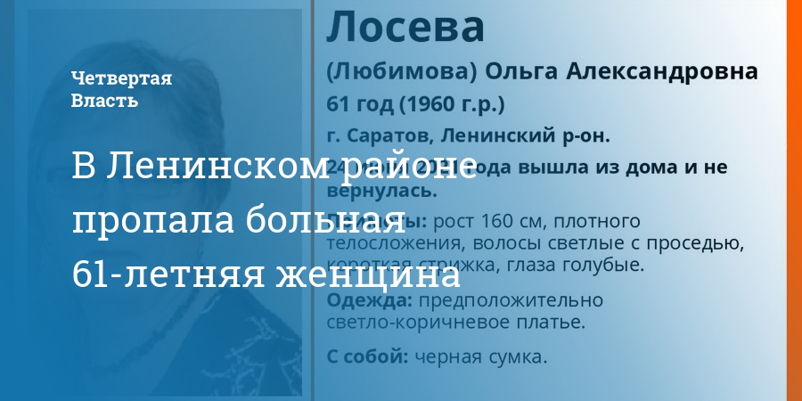 В Ленинском районе Саратова разыскивают 61-летнюю Ольгу Лосеву (Любимову). Она вышла из дома 24 июня и не вернулась, отмечается в поисковом сообществе «ЛизаАлерт».