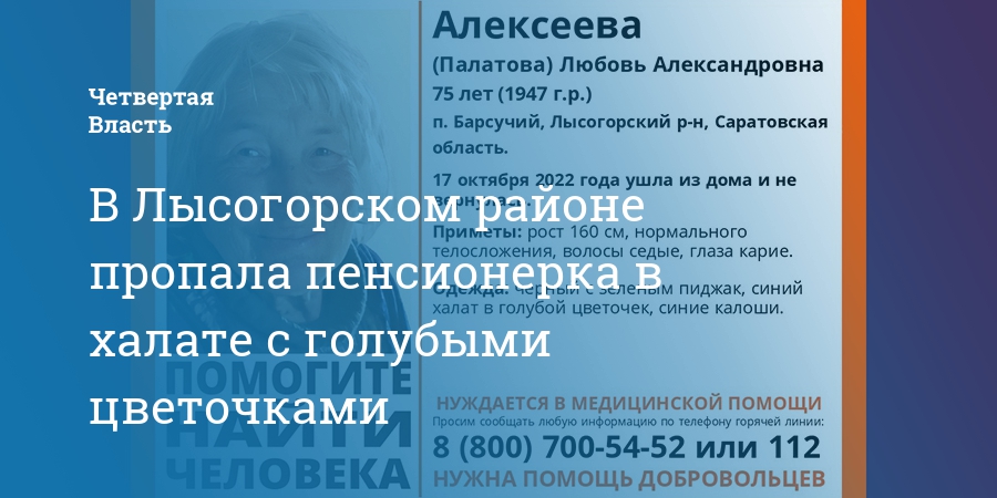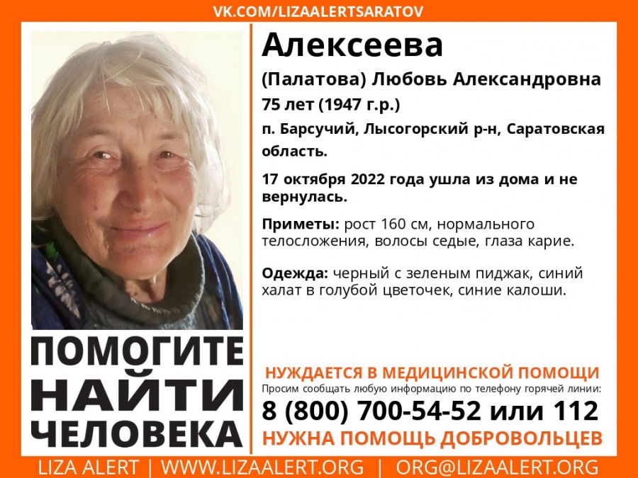 В Лысогорском районе Саратовской области без вести пропала 75-летняя Любовь Алексеева (Палатова). Об этом сообщили волонтеры поискового отряда «Лиза Алерт».