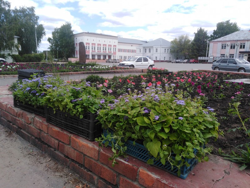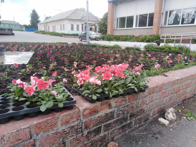 На центральной площади поселка высажены петунии, сальвия, агератум. Все лето работники обслуживающей организации будут ухаживать за цветами, поливать, полоть сорняки.