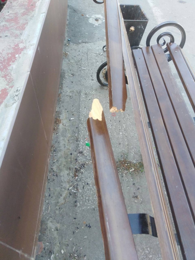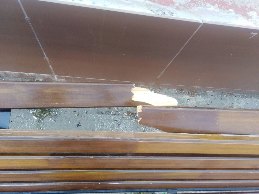 Возле здания МФЦ неизвестные оторвали у скамейки доски, сломали спинку. В администрации подчеркнули, что общественное место, включая скамейку, сделали в прошлом году за счет нацпроекта.
