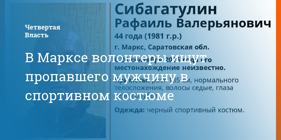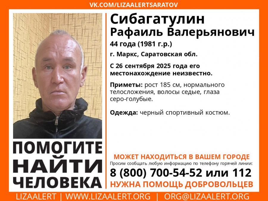 Его местонахождение не могут установить с 26 сентября. По данным волонтеров, мужчина 1981 г.р. пропал в Марксе, обстоятельства исчезновения не уточняются. Рост гражданина 185 см, телосложение нормальное, седые волосы, серо-голубые глаза. Был одет в черный спортивный костюм.