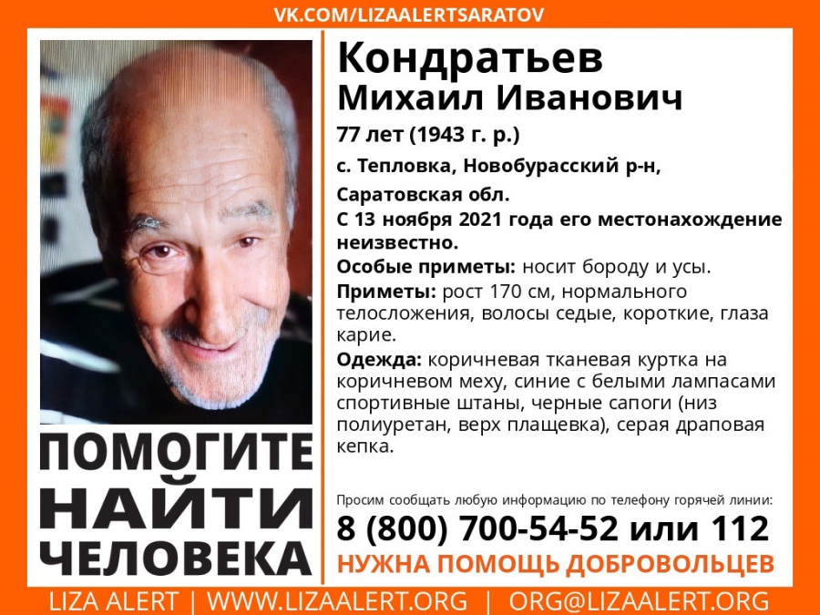 В Новобурасском районе Саратовской области пропал 77-летний Михаил Кондратьев. Об этом сообщили волонтеры поискового отряда «Лиза Алерт».