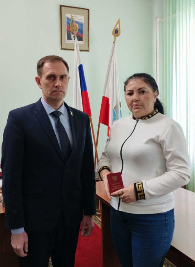 Помимо этого, первый заместитель главы администрации района Александр Шкрябин вручил удостоверение к ордену Мужества супруге погибшего в зоне СВО Андрея Козырева.