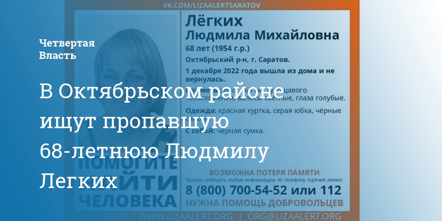 В Октябрьском районе Саратова волонтеры ищут без вести пропавшую 68-летнюю Людмилу Легких. Об этом сообщили в региональном штабе поискового отряда «Лиза Алерт».