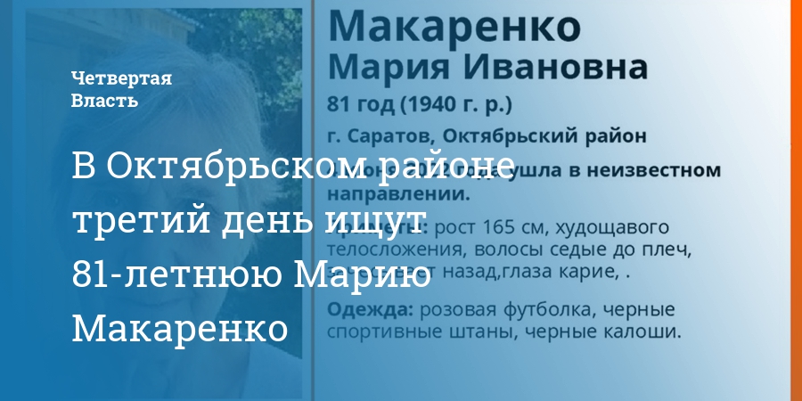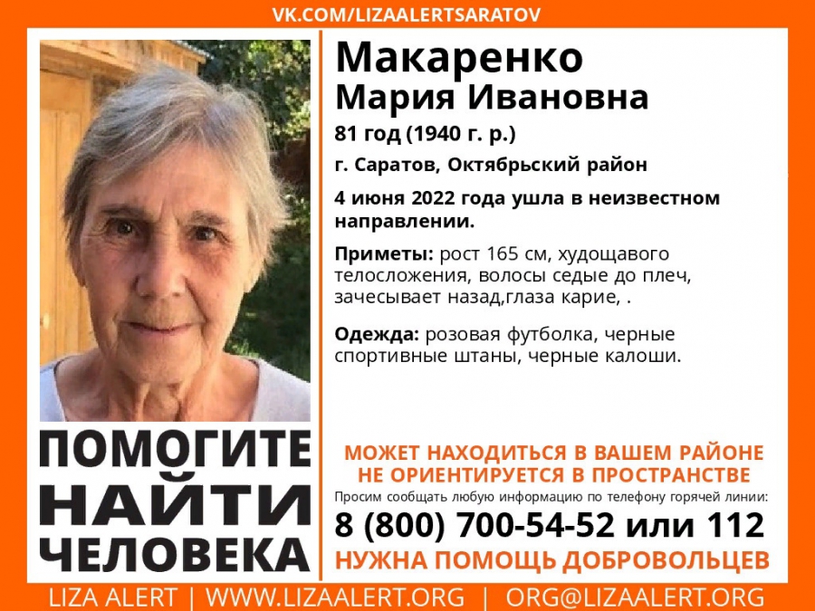 В Октябрьском районе Саратова без вести пропала 81-летняя Мария Макаренко. Об этом сообщают поисковики отряда «Лиза Алерт».
