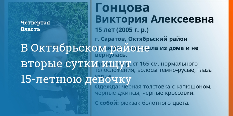 В Октябрьском районе Саратова ведется розыск без вести пропавшей 15-летней Виктории Гонцовой. Как сообщает поисково-спасательный отряд «Лиза Алерт», девочка не дает о себе знать с 4 мая.