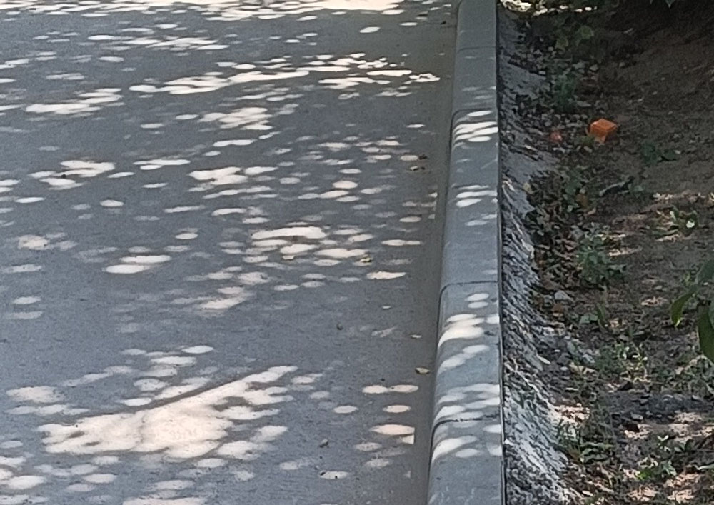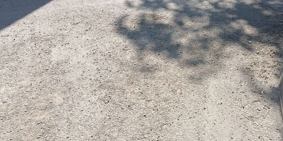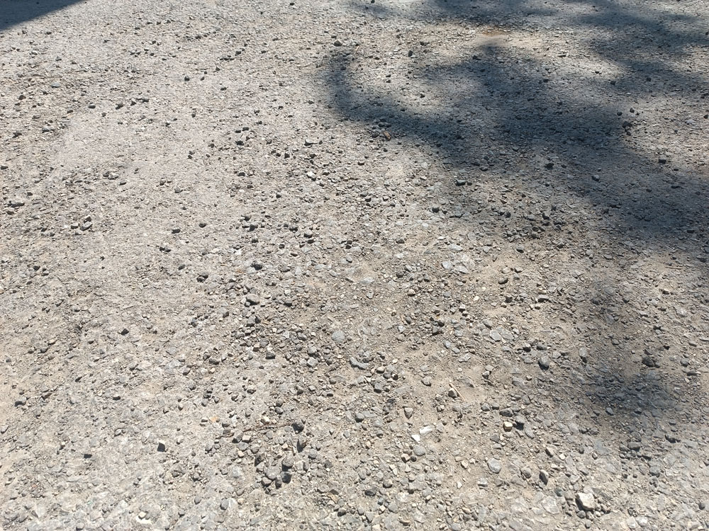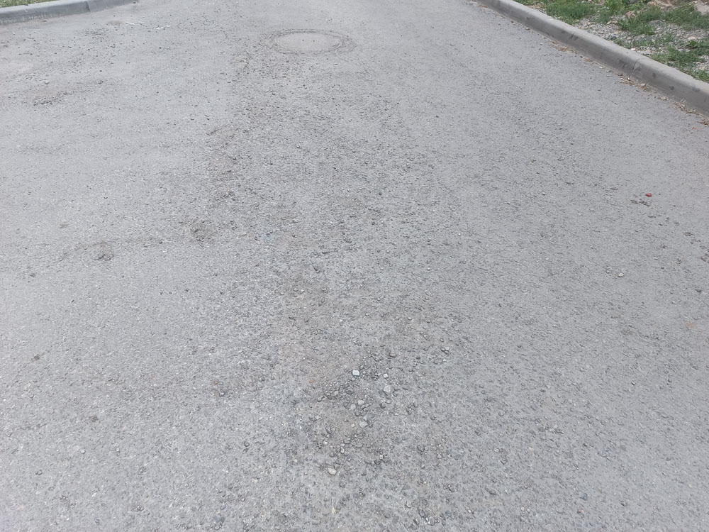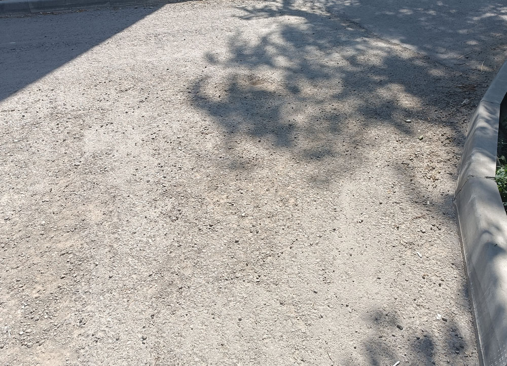 Щебень, выбившийся из покрытия, обильно усеял собой участок в 10 кв.м, примыкающий к дворовым проездам. Еще один участок выкрашивания расположен чуть ниже и широкой полосой в 0,5 м тянется к люку смотрового колодца. Это установили сотрудники «Дорожного контроля» в ходе очередного рейда.