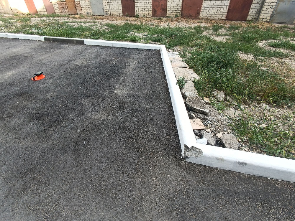 Напротив 7-го подъезда на парковке наблюдается участок в 3 кв.м с признаками легкого выкрашивания, однако при проверке участка плотномером коэффициент уплотнения оказался на уровне 0,99, что соответствует нормативным требованиям. А вот бортовой камень на парковке успел получить повреждения от наезда техники.