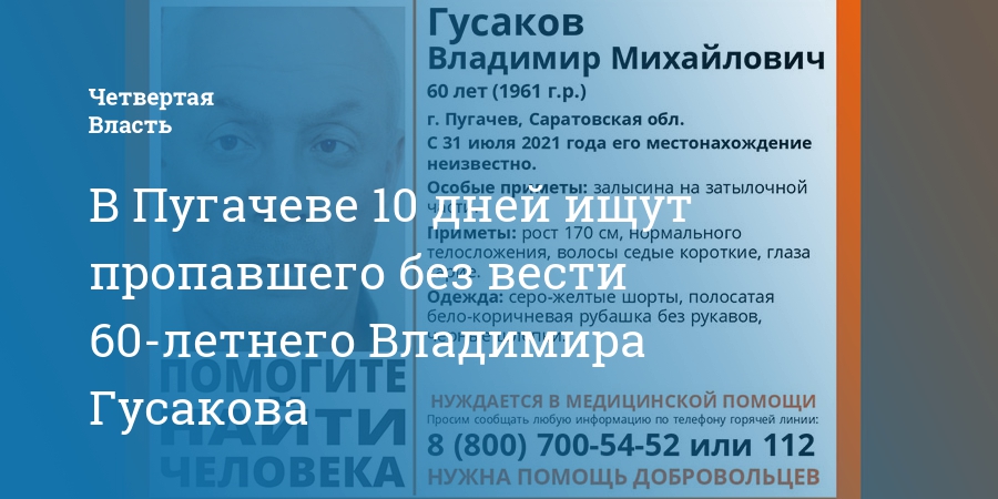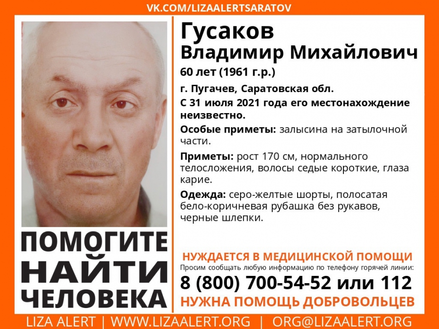 В Пугачеве Саратовской области идут поиски без вести пропавшего 60-летнего Владимира Гусакова. Об этом сообщили волонтеры отряда «Лиза Алерт».