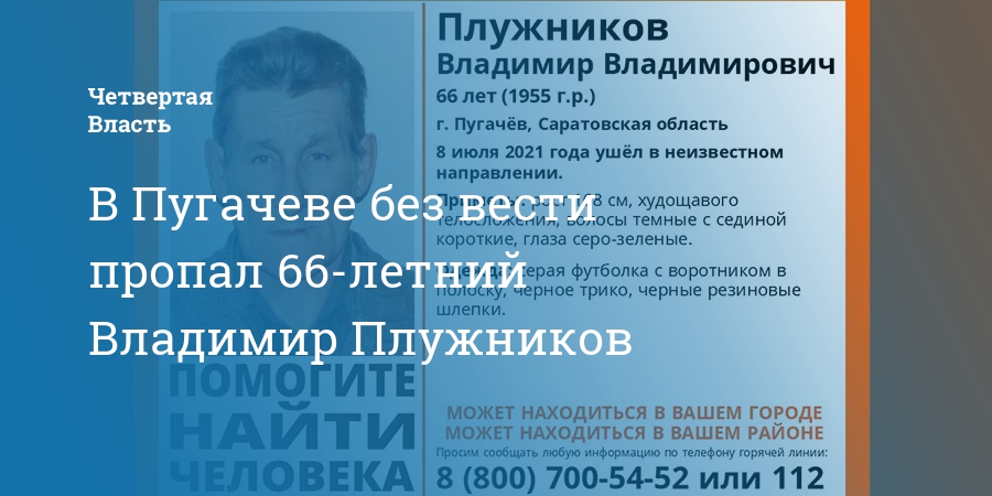Всех, кто располагает сведениями о Владимире Плужникове, просят звонить по номерам: 8 800 700 54 52 или 112.