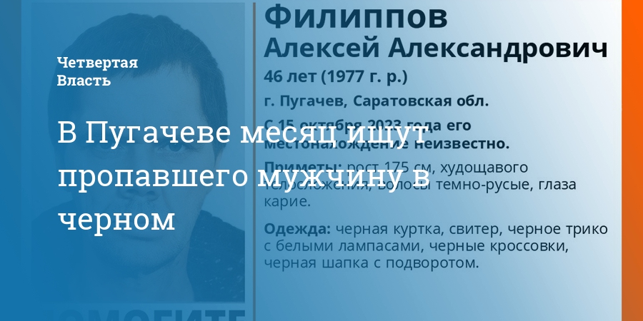 В Пугачеве Саратовской области ищут 46-летнего Алексея Филиппова. Об этом сообщили волонтеры поискового отряда «Лиза Алерт».