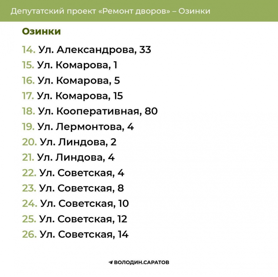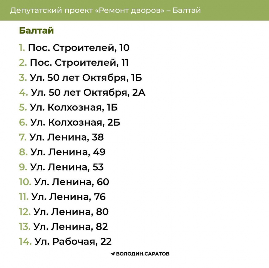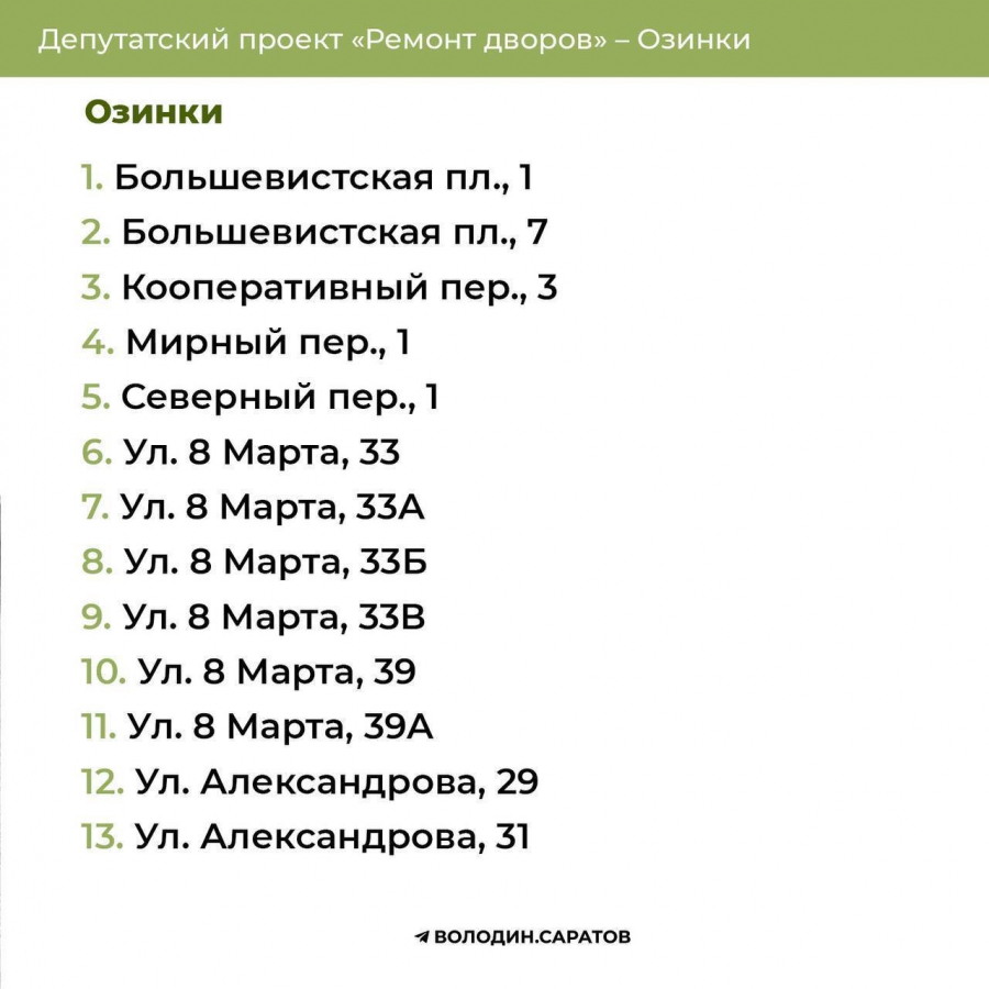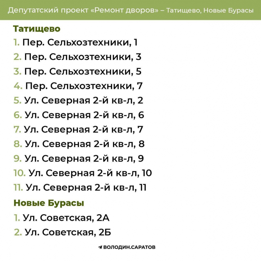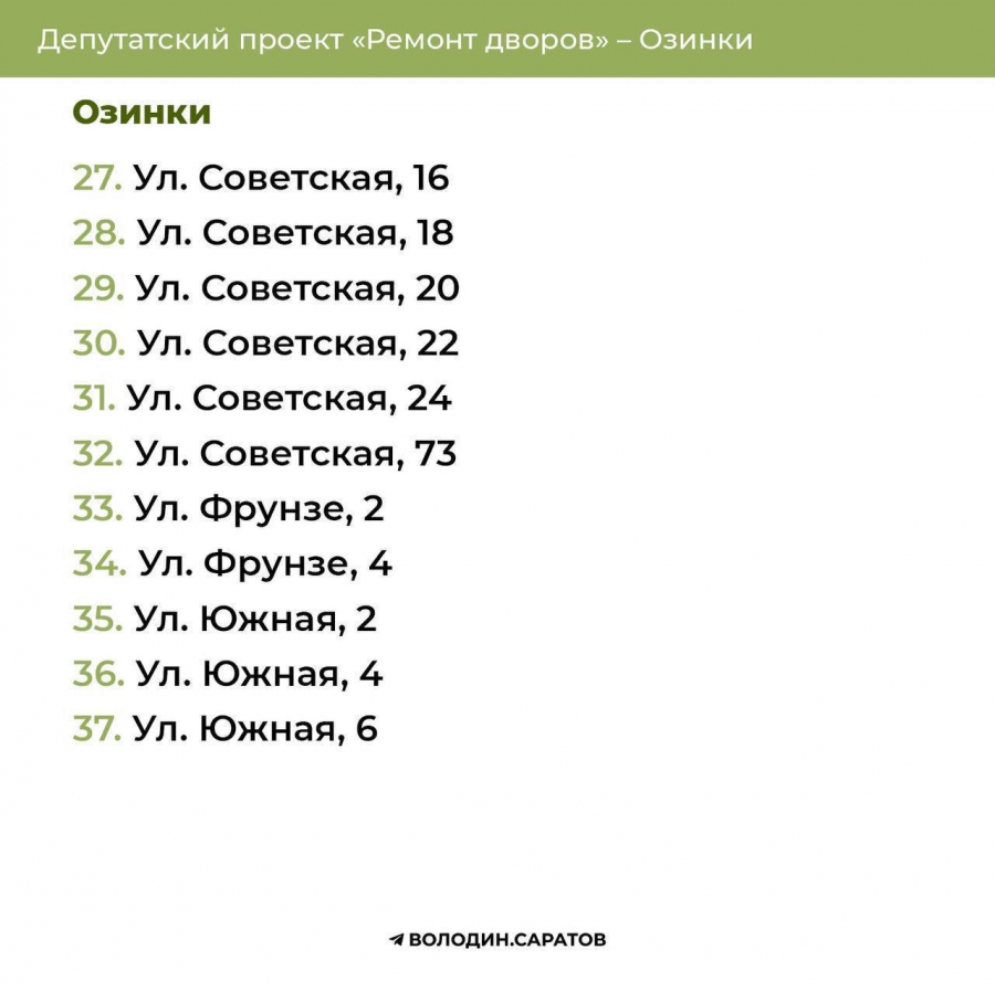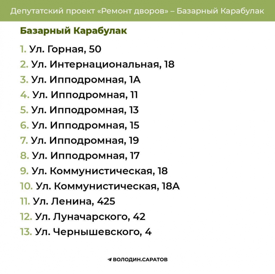 Дополнительные дворы для ремонта выбрали в Базарном Карабулаке, Татищеве, Новых Бурасах, Балтае и Озинках. Денежные средства для завершения депутатского проекта «Ремонт дворов» за счет привлеченных источников нашел Вячеслав Володин.
