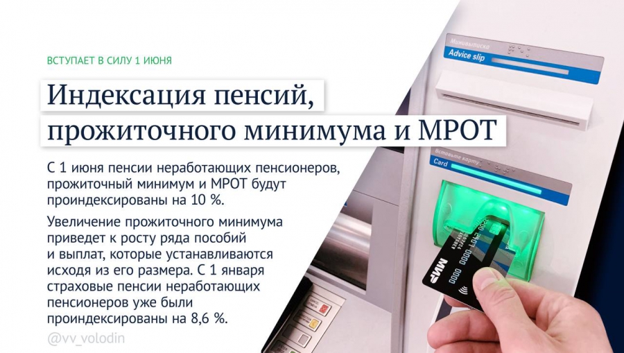 С 1 июня в России на 10% повышаются пенсии неработающих пенсионеров, а также прожиточный минимум и МРОТ.