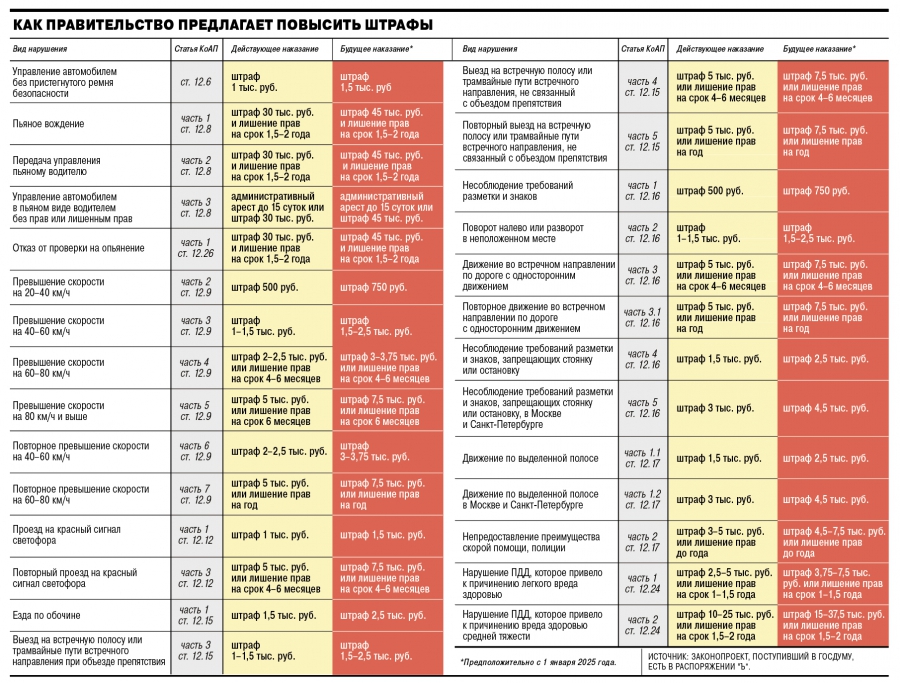 Согласно таблице, которую разместил «Коммерсант», изменения затронут многие пункты, касающиеся распространенных нарушений водителей. Ниже приведены некоторые из них: