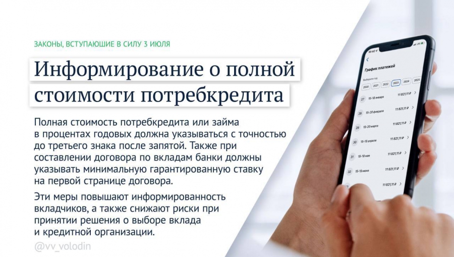 Помимо этого вводится информирование о полной стоимости потребительского кредита. Она должна указываться с точностью до третьего знака после запятой. Банки при составлении договора по вкладам должны будут указывать минимальную гарантированную ставку на первой странице договора. Меры призваны снизить риски жителей при принятии решений о выборе вклада и банка.
