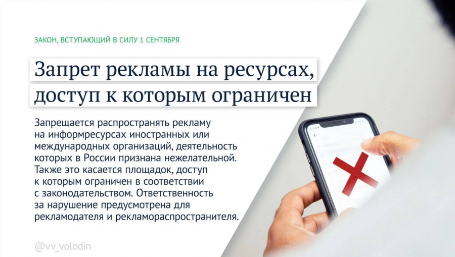 - Введен запрет рекламы на ограниченных и заблокированных ресурсах. Теперь рекламу нельзя распространять на тех информационных ресурсах, принадлежащих иностранным или международным организациям, деятельность которых признана в России нежелательной. Также это касается площадок, доступ к которым ограничен в соответствии с законодательством. Ответственность за нарушение предусмотрена как для рекламодателя, так и для рекламораспространителя.