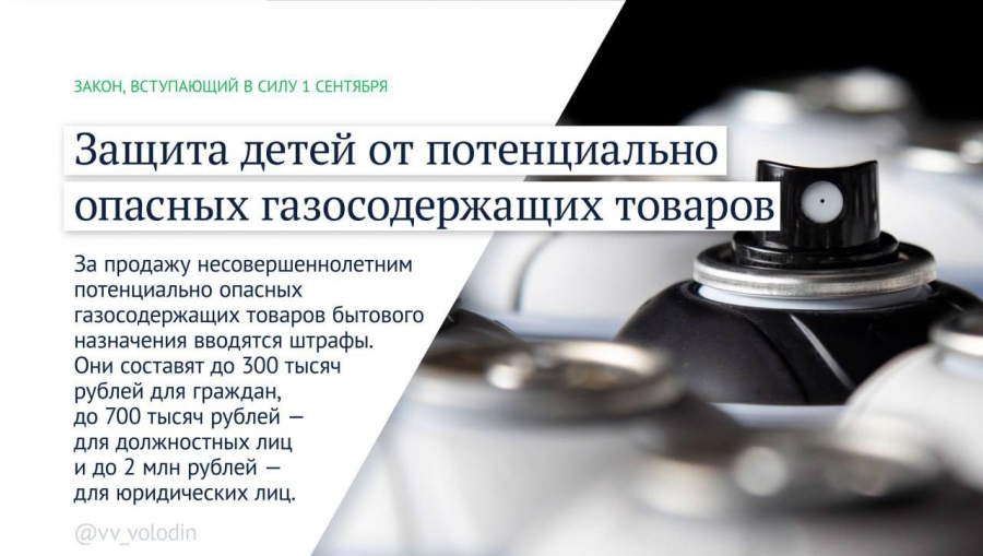 - Защита детей от потенциально опасных газосодержащих товаров. За продажу несовершеннолетним потенциально опасных товаров бытового назначения вводятся штрафы. Они составят для граждан до 300 тысяч рублей, для должностных лиц – до 700 тысяч рублей, для юридических лиц – до 2 млн рблей.