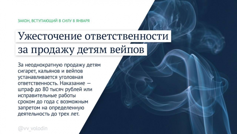 Также ужесточаются наказания за продажу вейпов несовершеннолетним. Теперь нарушителям будет грозить уголовная ответственность.