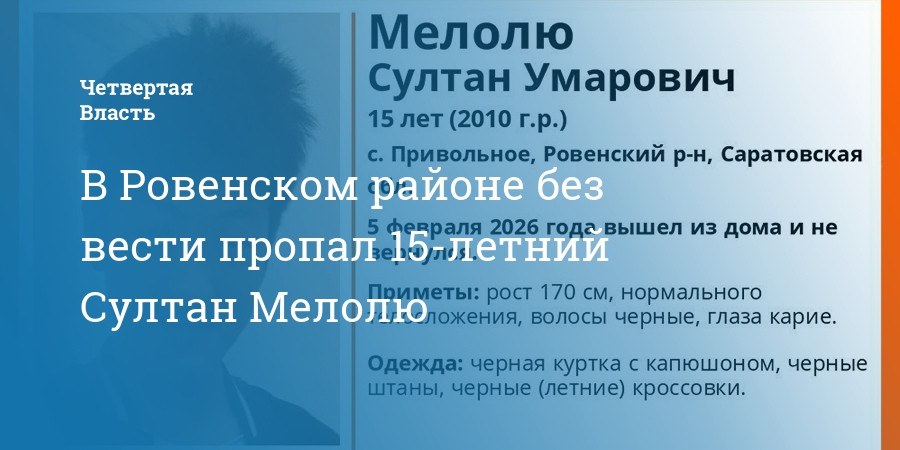 В Ровенском районе Саратовской области без вести пропал 15-летний подросток Султан Мелолю. Как сообщили в пресс-службе регионального ГУ МВД, сведений о его местонахождении нет уже два дня.