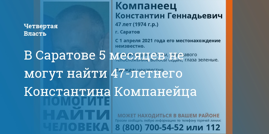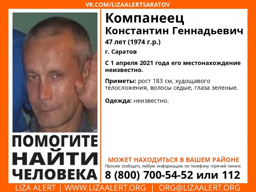 В Саратове без вести пропал 47-летний Константин Компанеец. Об этом сообщает поисковый отряд «Лиза Алерт».