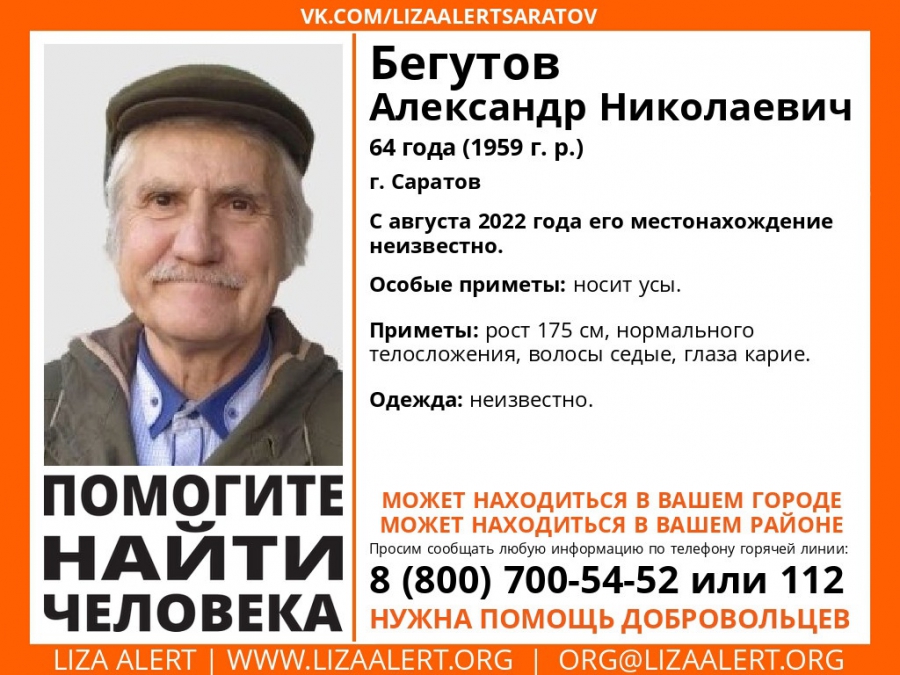 В Саратове продолжают поиск без вести пропавшего 64-летнего Александра Бегутова. Об этом сообщили в группе поискового отряда «ЛизаАлерт» соцсети «ВК».