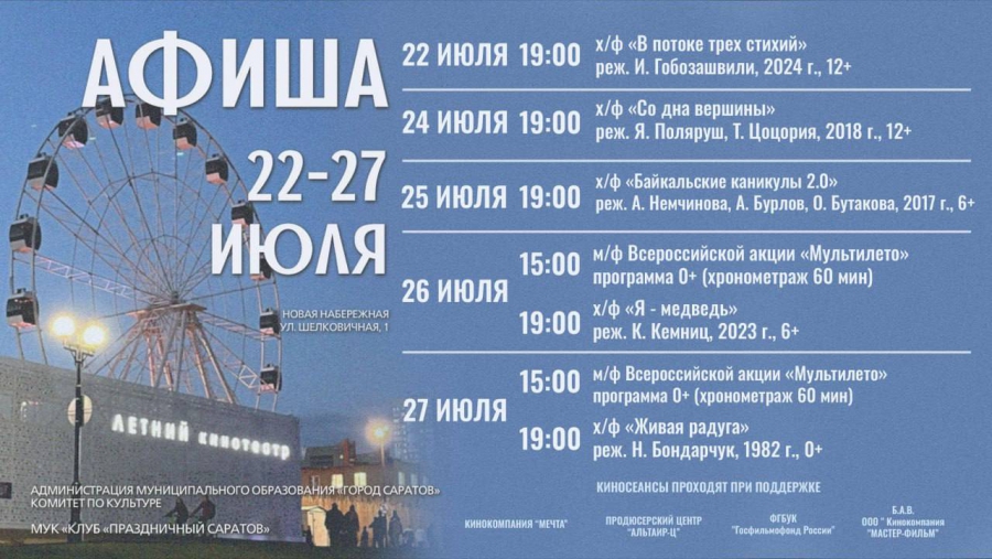 25 июля – художественный фильм «Байкальские каникулы 2.0» (начало в 19.00).