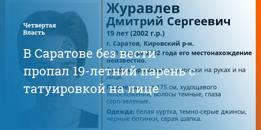 Среди примет пропавшего приводится рост 175 см, телосложение худощавое, волосы темные, глаза серо-зеленые, а также татуировки на руках и на лице. Предположительно, одет в белуют куртку, темно-серые джинсы, серую шапку и черные ботинки.