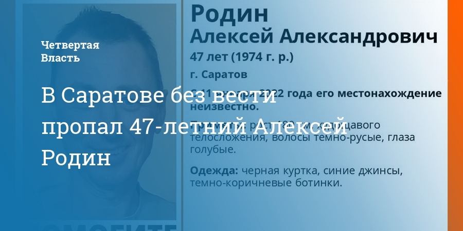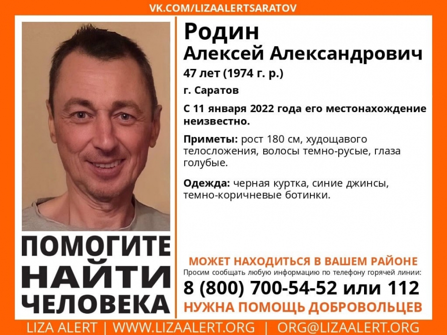 В Саратове без вести пропал 47-летний Алексей Родин. Об этом сообщает поисковый отряд «Лиза Алерт».