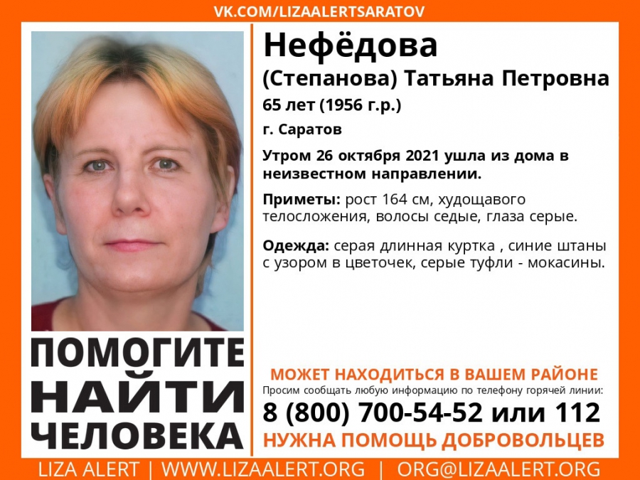 В Саратове без вести пропала 65-летняя Татьяна Нефедова (Степанова). Об этом сообщает поисковый отряд «Лиза Алерт».