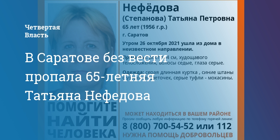 В Саратове без вести пропала 65-летняя Татьяна Нефедова