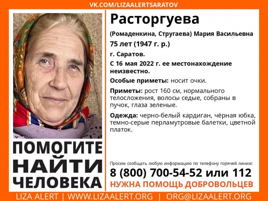 В Саратове без вести пропала 75-летняя Мария Расторгуева (Ромаденкина, Стругаева). Об этом сообщают волонтеры поискового отряда «Лиза Алерт».