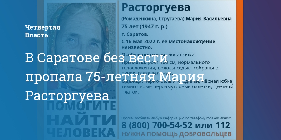 Всех, кому что-либо известно о Марии Васильевне, просят обращаться по телефонам: 8-800-700-54-52 или 112.