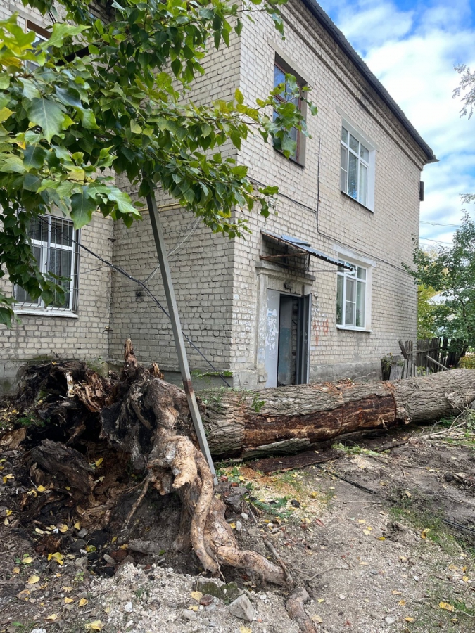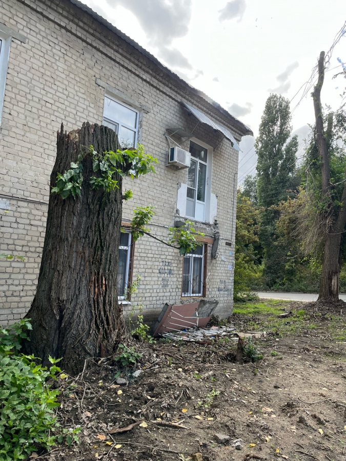 Первое, по его словам, разрушило балкон здания. Второе зацепило и выдернуло опору газовой трубы. Судя по фото, приложенным к посту, ствол растения также перегородил проход возле одного из подъездов.