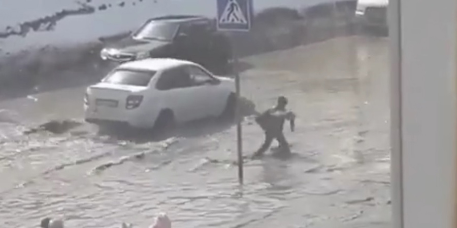 На нем видно, как школьник переходит проезжую часть буквально по колено в воде. При этом машины вокруг продолжают движение, поднимая волны. Автор поста утверждает, что «коммунальную реку» можно наблюдать на улице Антонова, 31. Каким образом она образовалась, не уточняется.