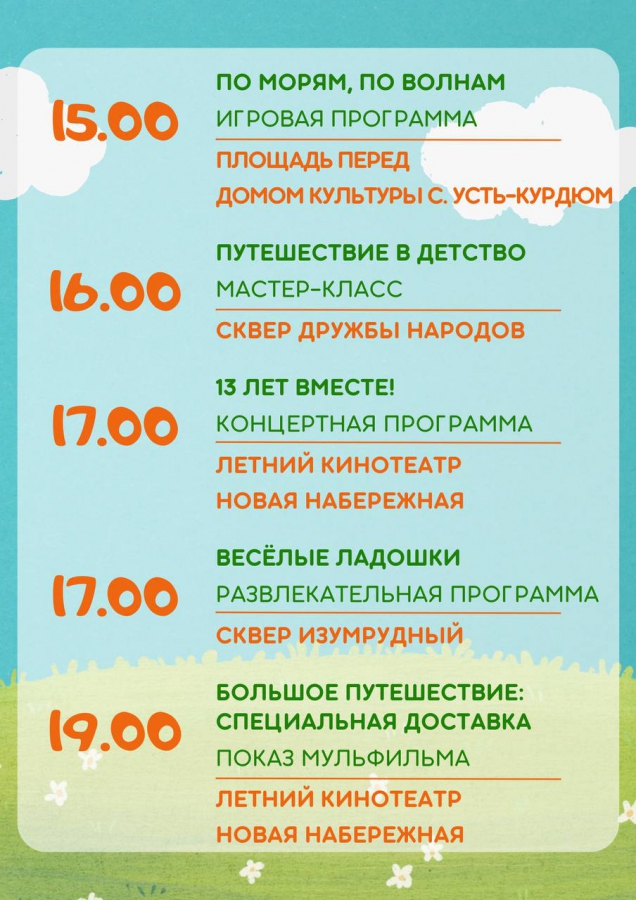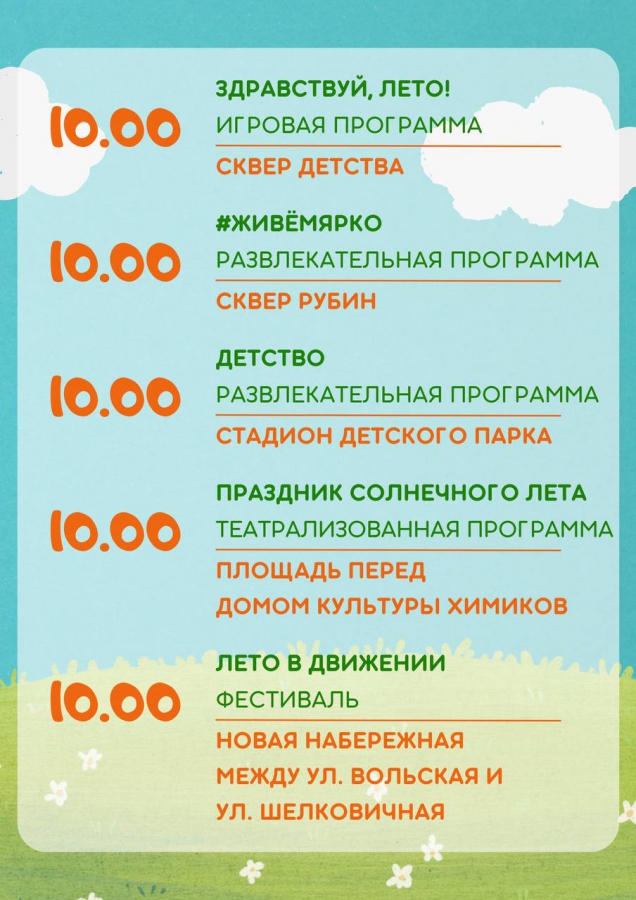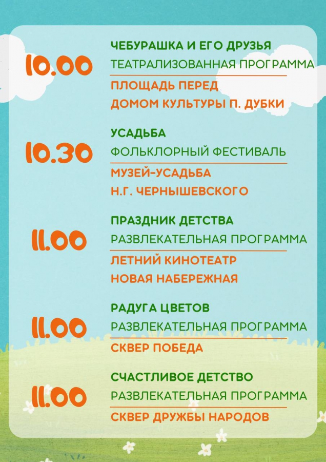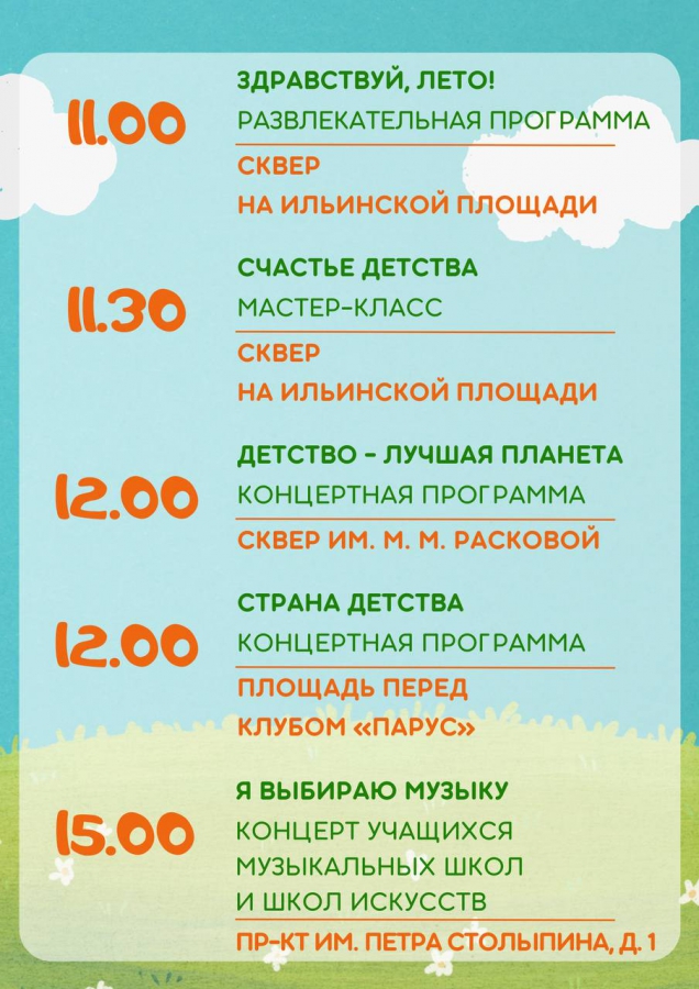 Развлекательные игры пройдут буквально во всех скверах и парках города. Представления для детей проведут в скверах Детства, Рубина, Дружбы народов, Победы и Марины Расковой. Концерты состоятся на площадках Новой Набережной, проспекта Столыпина и Ильинской площади. В поселке Дубки к детям на праздник придет Чебурашка и его друзья.