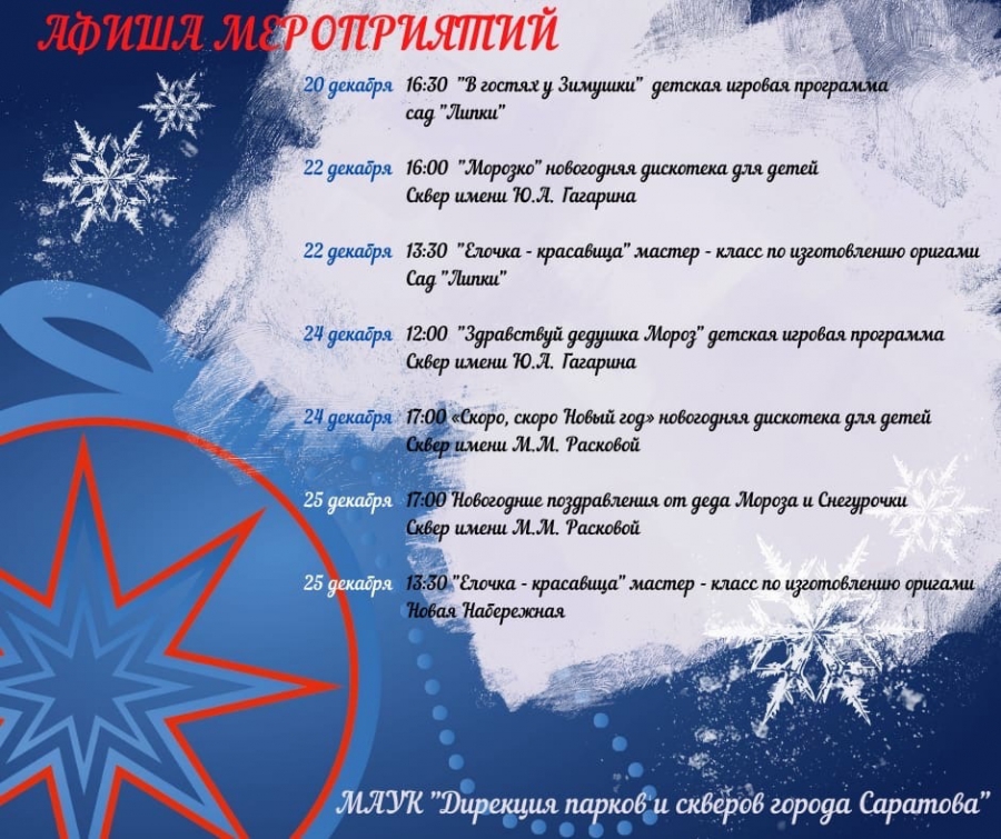 В выходные дни маленькие жители Саратова также смогут потанцевать и увидеться с Дедом Морозом и Снегурочкой. В субботу, 24 декабря, в 12.00 дети смогут проявить свою удаль в игровой программе в сквере Ю. А. Гагарина, а в 17.00 подвигаться под новогодние песни на дискотеке в сквере Марины Расковой.