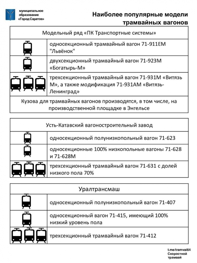 Наиболее популярными и массовыми моделями российских трамвайных вагонов, которые подходят под саратовские требования, оказались: «Львенок», «71-623», «71-628», «71-631» (односекционные), «Богатырь-М» (двухсекционный), «Витязь-М» (трехсекционный) и др. Производителями данных моделей являются «Усть-Катавский вагоностроительный завод» (Челябинская область), «Уралтрансмаш» (Урал) и «ПК Транспортные системы» (Энгельс).