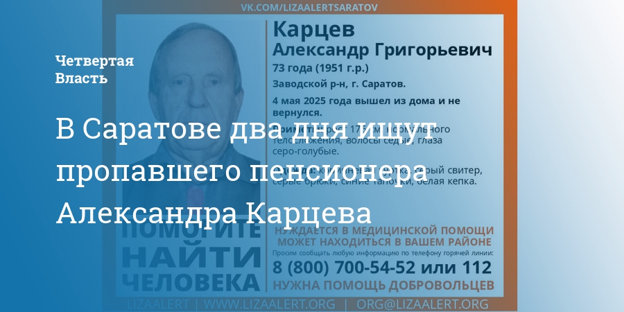 В Саратове без вести пропал 73-летний Александр Карцев. Об этом сообщили волонтеры поискового отряда «Лиза Алерт».