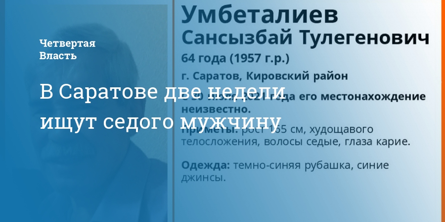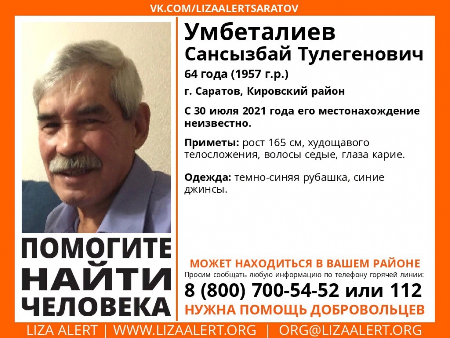 В Саратове с 30 июля ищут Сансызбая Умбеталиева. Как сообщает поисковое сообщество «ЛизаАлерт», мужчине 64 года.