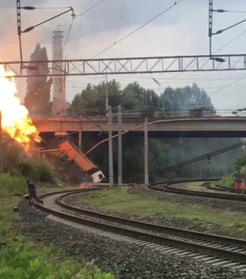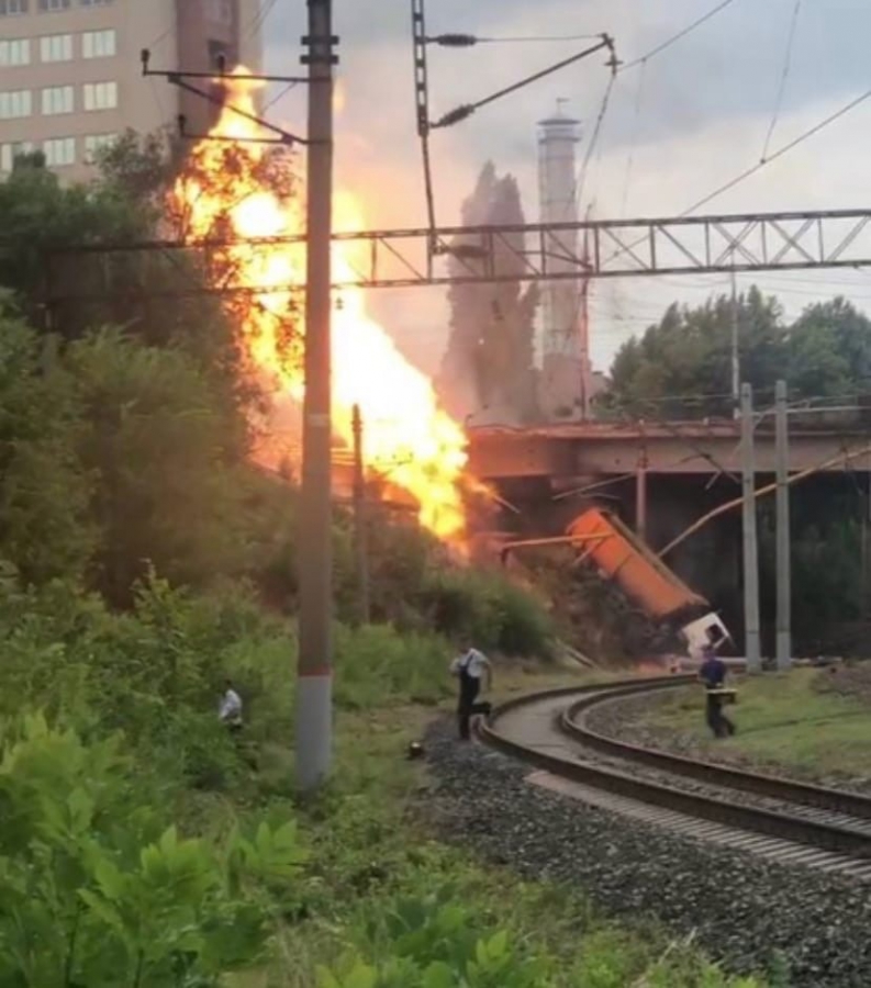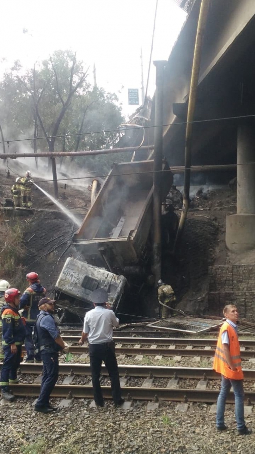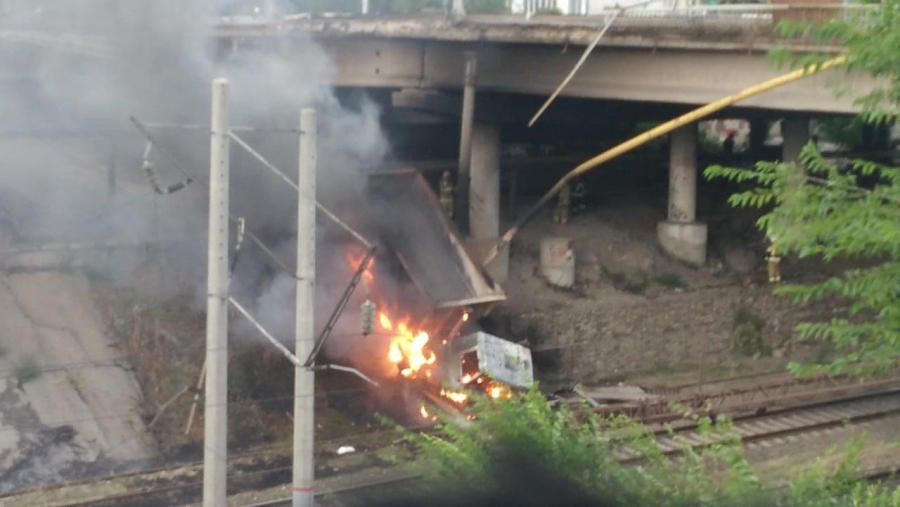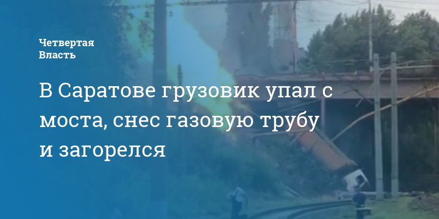 В Саратове грузовик упал с моста, снес газовую трубу и загорелся