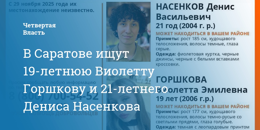 В Саратове ищут 19-летнюю Виолетту Горшкову и 21-летнего Дениса Насенкова