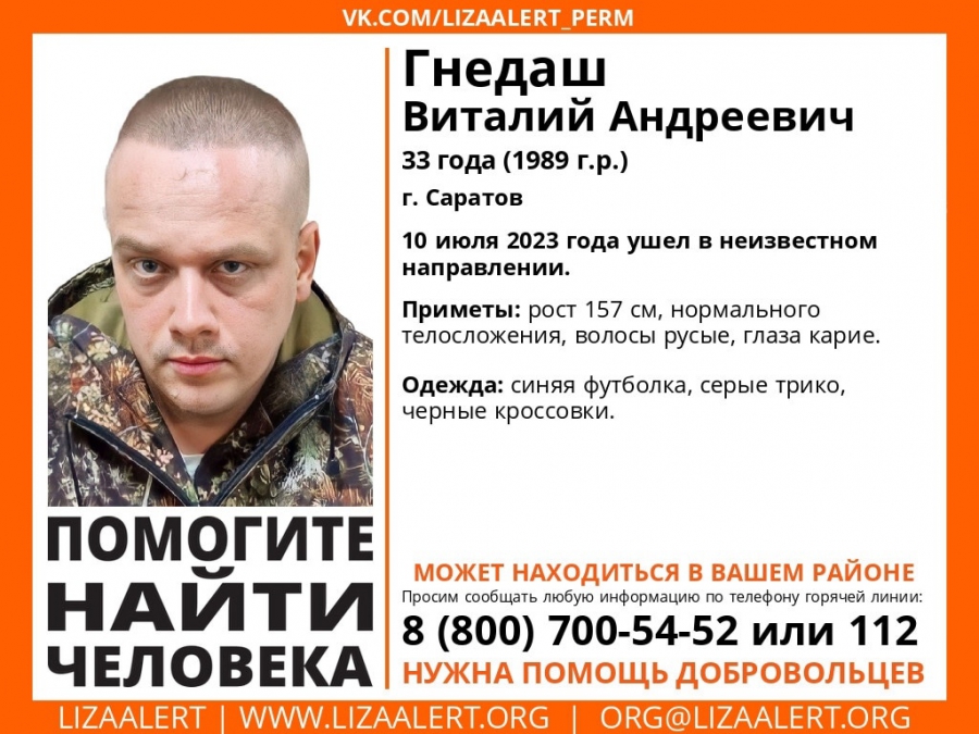 По данным поисковиков, Виталий Андреевич 1989 г. р. перестал выходить на связь с родными 10 июля. Из примет его внешности выделили: невысокий рост (157 см), нормальное телосложение, русые волосы и карие глаза.