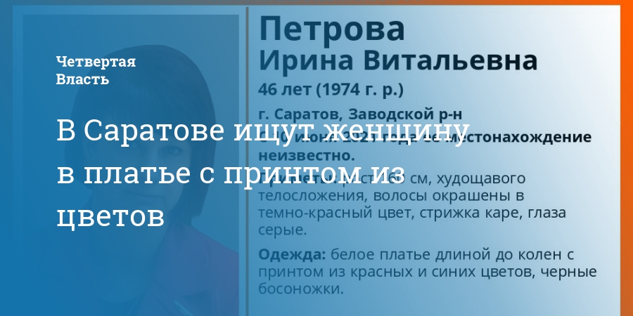 В Саратове пропала 46-летняя Ирина Петрова. Об этом сообщает поисковое сообщество «ЛизаАлерт».