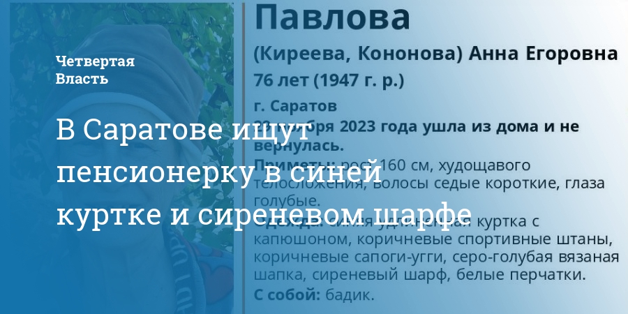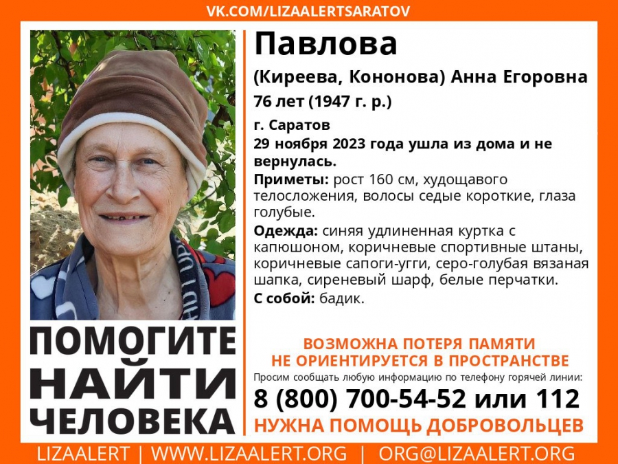 В Саратове разыскивают пропавшую 76-летнюю Анну Павлову (Кирееву, Кононову). Об этом сегодня, 30 ноября, сообщили волонтеры поискового отряда «Лиза Алерт».