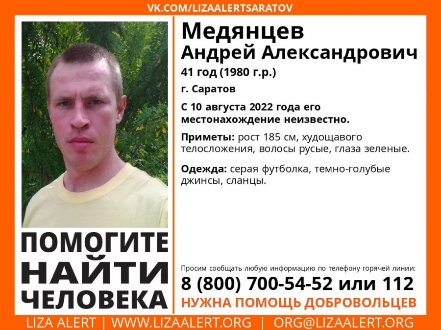 Андрей Медянцев пропал 10 августа. В качестве примет указано: рост 185 см, худощавого телосложения, волосы русые, глаза зеленые. Одет в серую футболку, темно-голубые джинсы, сланцы.