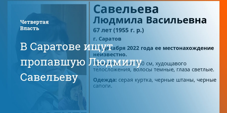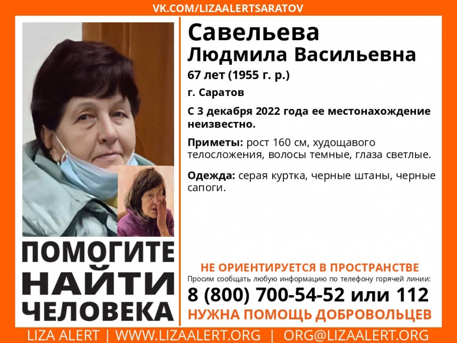 Местонахождение женщины неизвестно с 3 декабря. Рост пропавшей 160 см, у нее худощавое телосложение, темные волосы и светлые глаза. В день исчезновения Людмила была одета в серую куртку, черные штаны и сапоги. Волонтеры предупредили, что саратовчанка не ориентируется в пространстве.