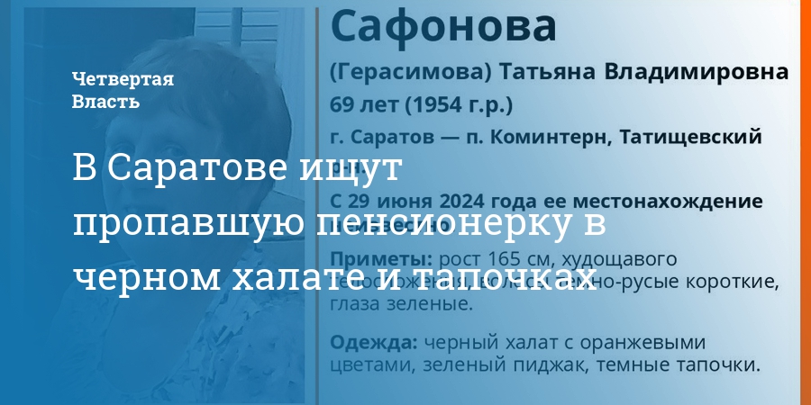В Саратове пропала без вести 69-летняя Татьяна Сафонова (Герасимова). Об этом сообщили в соцсетях поискового отряда «ЛизаАлерт».